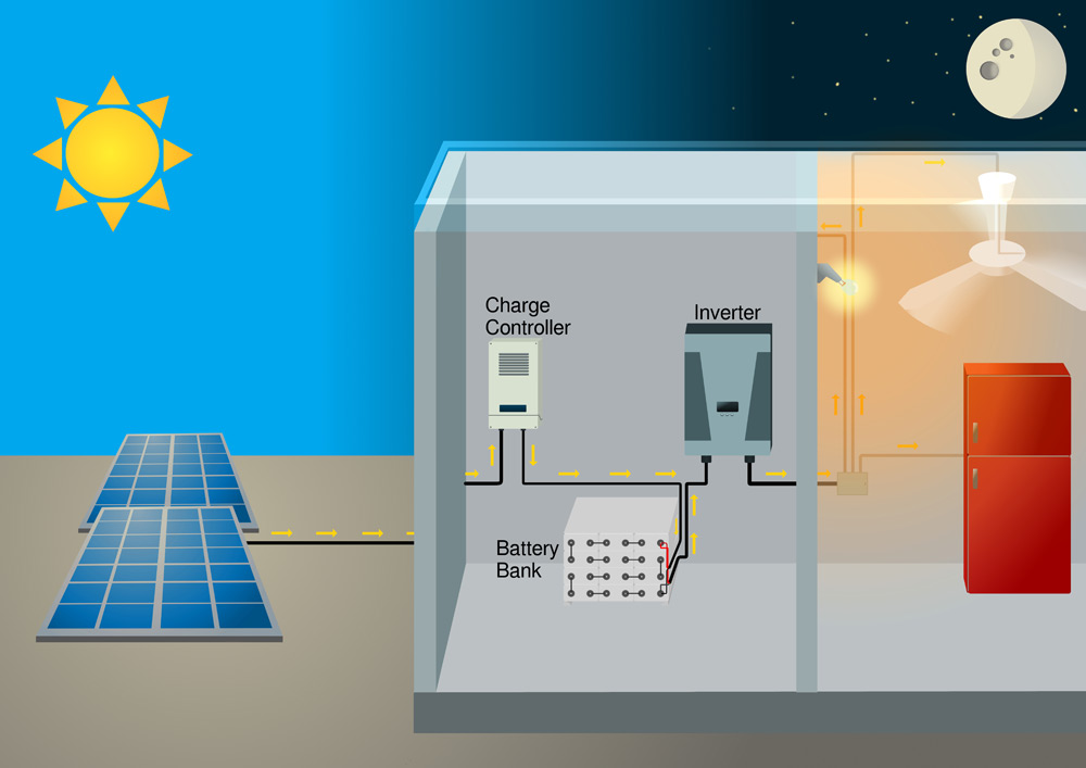 An off-grid solar system is best suited for remote areas with poor or no access to the grid. As the name suggests, this solution is completely independent of the grid and can be configured to power a wide range of appliances from lights and fans to fridges, washing machines, computers and even air-conditioners!